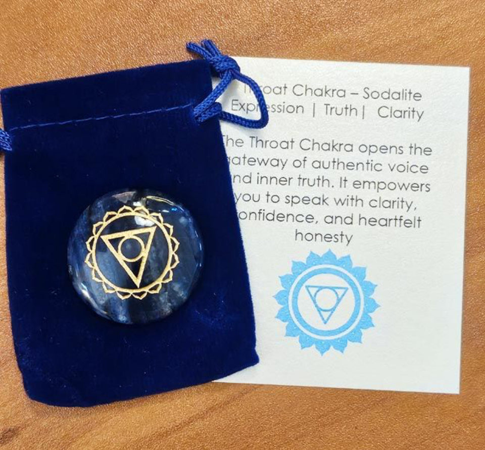 💙 Throat Chakra – Sodalite - The Throat Chakra opens the gateway of authentic voice and inner truth. Sodalite, with its deep indigo swirls, harmonizes logic and intuition, helping you speak with clarity, confidence, and heartfelt honesty. It encourages courageous communication and the wisdom to listen deeply.
