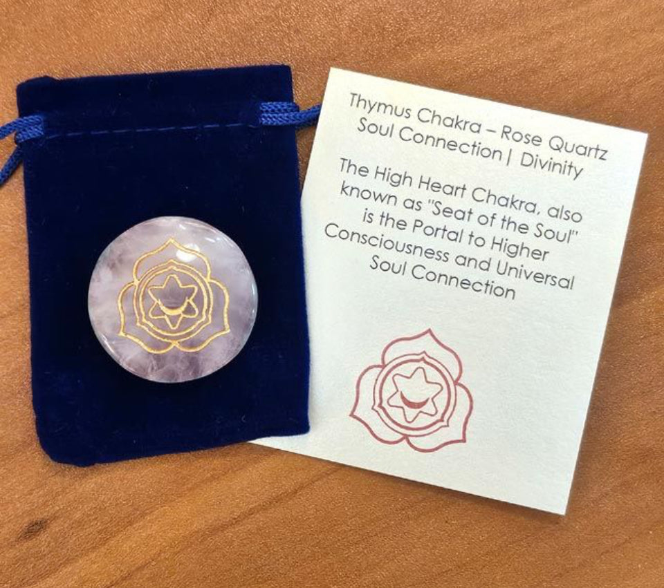🩷 High Heart Chakra – Thymus - The High Heart Chakra, a the center of the chest, is also known as "Seat of the Soul". It is the Portal to Highest Consciousness and Universal Soul Connection. Rose Quartz, with its soft pink glow, opens this sacred center to unconditional love, soul-level healing, and the grace of forgiveness. It invites you to love without fear, to speak with kindness, and to hold space for your own healing.